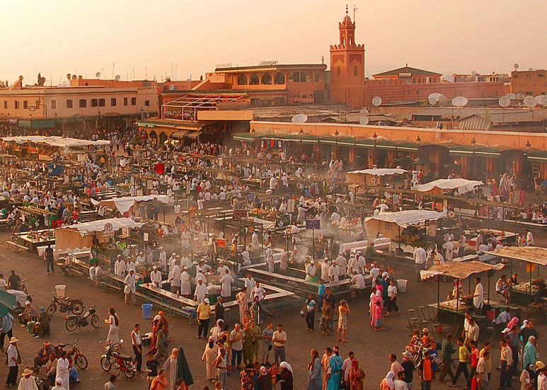 Prima colazione in albergo a buffet. Visita di Casablanca con la Moschea Hassan II affacciata sull'Oceano Atlantico. Lo splendido minareto alto 200 metri e la sala di preghiera che può ospitare 25.000 fedeli, la rende la più grande moschea del mondo. Tappeti, specchi, ceramiche, marmi preziosi fanno di questo complesso uno tra i più straordinari centri religiosi dell’Islam. L’itinerario proseguirà lungo il Boulevard delle Corniche, il lungomare e la strada della costa per Anfa. Pranzo a Casablanca. Partenza per Marrakech e visita della famosa piazza Jemaa el Fna, nota per l'enorme mercato all'aperto che cambia più volte aspetto nell'arco della giornata con bancarelle dell'artigianato locale, banchi di venditori di datteri e frutta secca, fumosi ristoranti tipici, decoratori con l'hennè, chiromanti, cavadenti, suonatori, incantatori di serpenti, ammaestratori di scimmie. Cena in albergo e pernottamento a Marrakech.