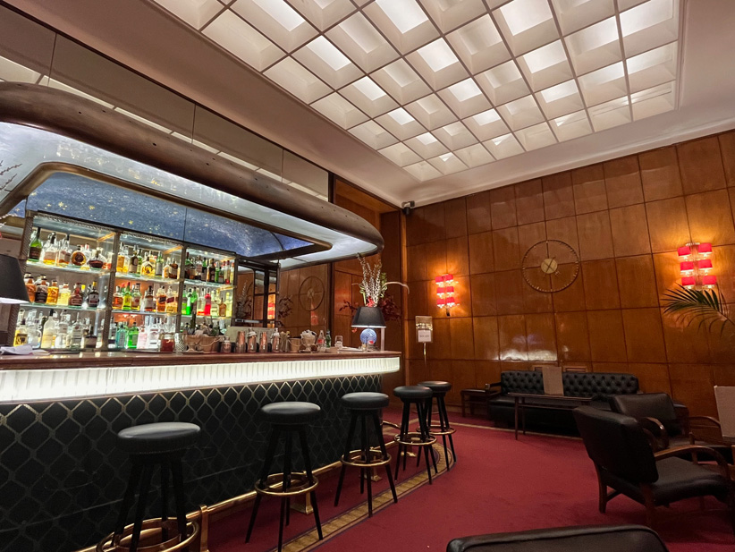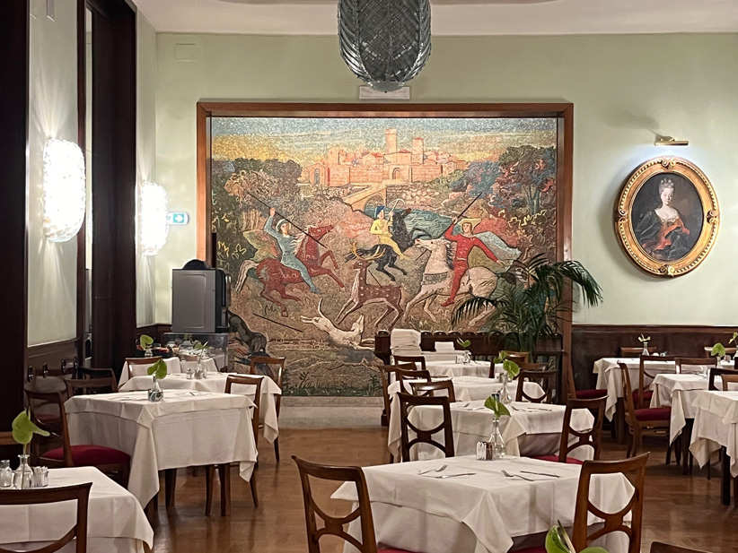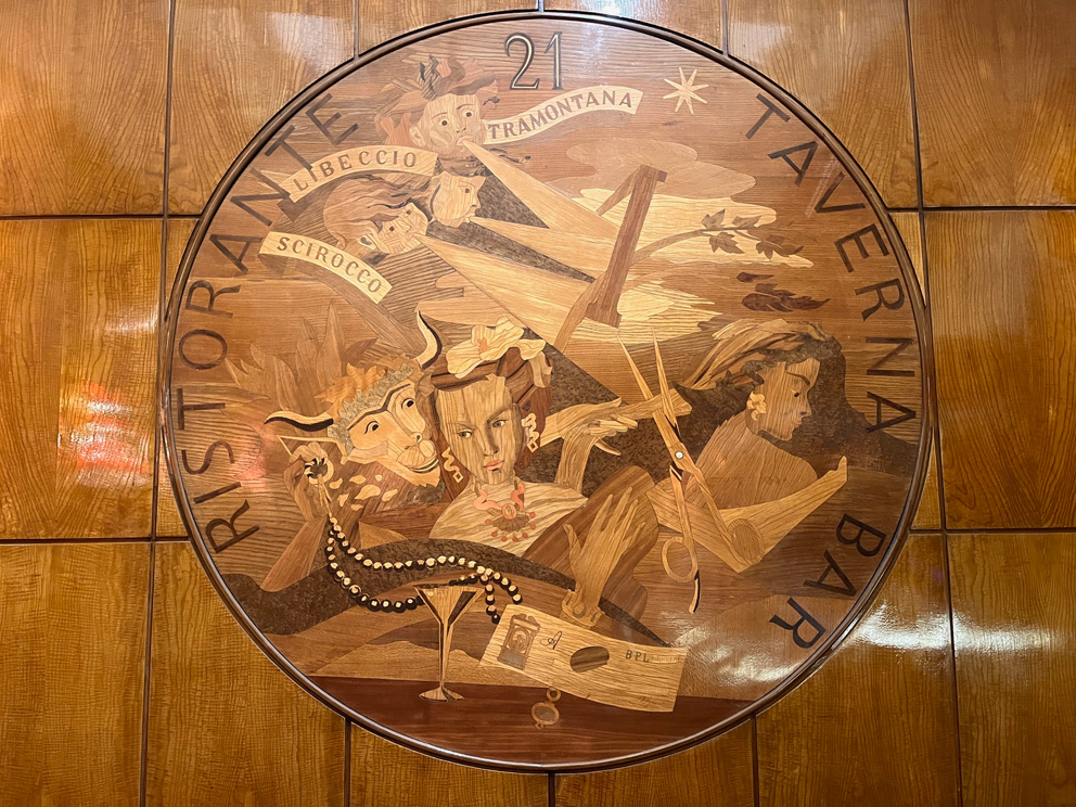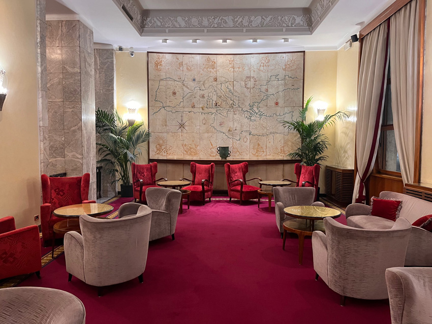 Una visita di sicuro interesse all’interno di una cornice storica che ci riporterà agli anni Trenta. Degustando comodamente uno spritz avremo modo di fare un excursus storico e culturale sul Novecento e sulla storia degli alberghi romani. L’albergo Mediterraneo è un capolavoro dell’architettura razionalista, progettato nel 1936 e terminato nel 1942 dall'architetto Mario Loreti in vista dell’Esposizione Universale di Roma del 1942. Pare che fu proprio Mussolini a richiedere un albergo degno della città in vista dell’esposizione del 1942 e che, in deroga al PRG, l’ raggiunse i 50 metri d’altezza divenendo il palazzo più alto del centro di Roma. Un monumentale edificio interamente rivestito in marmo che doveva imporsi agli occhi dei visitatori di Roma. Varcata la soglia d’ingresso si torna indietro di novant’anni, tutto è immutato e amorevolmente conservato dalla Famiglia Bettoja, proprietaria dell’albergo da sempre. L’atrio interamente rivestito di marmo bardiglio conduce alla Sala del camino con l’intarsio ligneo di Prometeo e alla Sala della mappa, dipinta su pergamena e circondata da segni zodiacali. Nella stessa sala si conserva anche un grande pannello intarsiato di legno con l’“Allegoria della Scrittura attraverso la Storia”. Poco oltre si apre la sala del “Bar 21” con un enigmatico pannello la cui soluzione risulta ancora un mistero. Si ammireranno i raffinati ed eleganti arredi Art Déco, poltrone, lampadari e lampade in vetro di Murano disegnati da Giò Ponti, altri lampadari dell’architetto Gustavo Pulitzer Finali, mosaici e tarsie in legno, affreschi ispirati al tema del mare, mosaici di Franco D’Urso e Achille Capizzano.