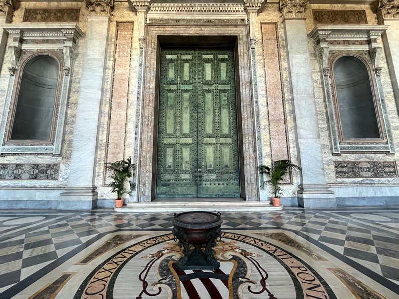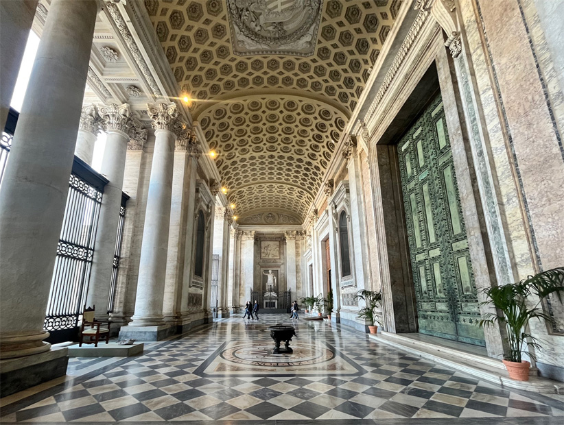 La cattedrale di Roma, San Giovanni in Laterano, è la più antica delle quattro basiliche maggiori di Roma e fu voluta nella prima metà del IV sec. d.C. da Costantino e fu costruita sopra la caserma dei Castra Nova Equites singulares, a 5 imponenti navate precedute da un quadriportico. Insieme alla Scala Santa, al palazzo e ad altri edifici scomparsi costituiva la cittadella lateranense del Patriarchio. Fino al trasferimento papale ad Avignone era il centro del potere pontificio: vi fu battezzato nel 774 Carlo Magno, qui fu ascoltato San Francesco e nel 1300 dal Laterano Papa Bonifacio VIII indisse il primo Giubileo della storia nel 1300. Nel X secolo la basilica fu rinnovata e per il Giubileo del 1650 fu intrapreso un colossale lavoro di rinnovamento affidato al Borromini e nel secolo successivo Alessandro Galilei vi aggiunse la maestosa facciata. La visita ci farà conoscere il portale bronzeo della Curia del Foro Romano, il magnifico pavimento cosmatesco (tra i più grandi di Roma), i lacerti degli affreschi di Giotto, gli affreschi dei pittori di Sisto V nel transetto, il ciborio gotico della crociera che contiene le reliquie delle teste dei Santi Pietro e Paolo, la statua bronzea di Enrico IV di Francia, l’imponente mosaico dell’abside di Jacopo Torriti. Infine passeremo al chiostro, voluto dal 1222 da papa Onorio III e realizzato ad opera dei bottega dei marmorari romani dei Vassalletto.