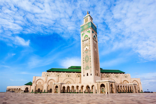 Prima colazione in albergo a buffet. Visita di Casablanca con la Moschea Hassan II affacciata sull'Oceano Atlantico. Lo splendido minareto alto 200 metri e la sala di preghiera che può ospitare 25.000 fedeli, la rende la più grande moschea del mondo. Tappeti, specchi, ceramiche, marmi preziosi fanno di questo complesso uno tra i più straordinari centri religiosi dell’Islam. L’itinerario proseguirà lungo il Boulevard delle Corniche, il lungomare e la strada della costa per Anfa. Pranzo a Casablanca. Partenza per Marrakech e visita della famosa piazza Jemaa el Fna, nota per l'enorme mercato all'aperto che cambia più volte aspetto nell'arco della giornata con bancarelle dell'artigianato locale, banchi di venditori di datteri e frutta secca, fumosi ristoranti tipici, decoratori con l'hennè, chiromanti, cavadenti, suonatori, incantatori di serpenti, ammaestratori di scimmie. Cena in albergo e pernottamento a Marrakech.