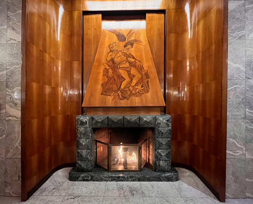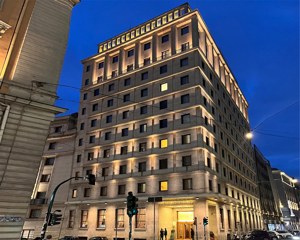 Una visita di sicuro interesse all’interno di una cornice storica che ci riporterà agli anni Trenta. Degustando comodamente uno spritz avremo modo di fare un excursus storico e culturale sul Novecento e sulla storia degli alberghi romani. L’albergo Mediterraneo è un capolavoro dell’architettura razionalista, progettato nel 1936 e terminato nel 1942 dall'architetto Mario Loreti in vista dell’Esposizione Universale di Roma del 1942. Pare che fu proprio Mussolini a richiedere un albergo degno della città in vista dell’esposizione del 1942 e che, in deroga al PRG, l’ raggiunse i 50 metri d’altezza divenendo il palazzo più alto del centro di Roma. Un monumentale edificio interamente rivestito in marmo che doveva imporsi agli occhi dei visitatori di Roma. Varcata la soglia d’ingresso si torna indietro di novant’anni, tutto è immutato e amorevolmente conservato dalla Famiglia Bettoja, proprietaria dell’albergo da sempre. L’atrio interamente rivestito di marmo bardiglio conduce alla Sala del camino con l’intarsio ligneo di Prometeo e alla Sala della mappa, dipinta su pergamena e circondata da segni zodiacali. Nella stessa sala si conserva anche un grande pannello intarsiato di legno con l’“Allegoria della Scrittura attraverso la Storia”. Poco oltre si apre la sala del “Bar 21” con un enigmatico pannello la cui soluzione risulta ancora un mistero. Si ammireranno i raffinati ed eleganti arredi Art Déco, poltrone, lampadari e lampade in vetro di Murano disegnati da Giò Ponti, altri lampadari dell’architetto Gustavo Pulitzer Finali, mosaici e tarsie in legno, affreschi ispirati al tema del mare, mosaici di Franco D’Urso e Achille Capizzano.