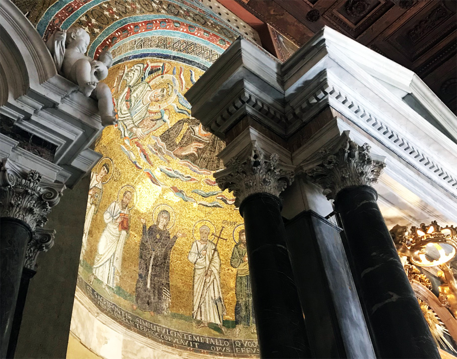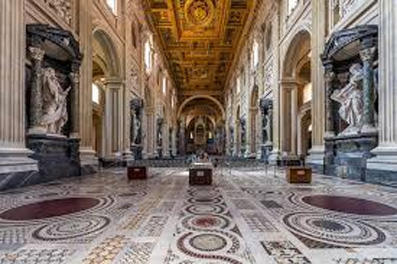La cattedrale di Roma, San Giovanni in Laterano, è la più antica delle quattro basiliche maggiori di Roma e fu voluta nella prima metà del IV sec. d.C. da Costantino e fu costruita sopra la caserma dei Castra Nova Equites singulares, a 5 imponenti navate precedute da un quadriportico. Insieme alla Scala Santa, al palazzo e ad altri edifici scomparsi costituiva la cittadella lateranense del Patriarchio. Fino al trasferimento papale ad Avignone era il centro del potere pontificio: vi fu battezzato nel 774 Carlo Magno, qui fu ascoltato San Francesco e nel 1300 dal Laterano Papa Bonifacio VIII indisse il primo Giubileo della storia nel 1300. Nel X secolo la basilica fu rinnovata e per il Giubileo del 1650 fu intrapreso un colossale lavoro di rinnovamento affidato al Borromini e nel secolo successivo Alessandro Galilei vi aggiunse la maestosa facciata. La visita ci farà conoscere il portale bronzeo della Curia del Foro Romano, il magnifico pavimento cosmatesco (tra i più grandi di Roma), i lacerti degli affreschi di Giotto, gli affreschi dei pittori di Sisto V nel transetto, il ciborio gotico della crociera che contiene le reliquie delle teste dei Santi Pietro e Paolo, la statua bronzea di Enrico IV di Francia, l’imponente mosaico dell’abside di Jacopo Torriti. Infine passeremo al chiostro, voluto dal 1222 da papa Onorio III e realizzato ad opera dei bottega dei marmorari romani dei Vassalletto.