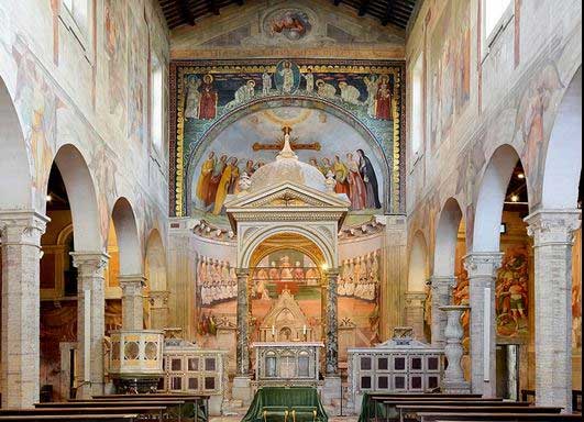 Importante opportunità per visitare la chiesa che è stata appena restaurata in occasione del Giubileo 2025. E' costruita nel luogo in cui, secondo la tradizione, San Pietro aveva perso una benda al piede (fasciola) durante la fuga da Roma, lungo la via Appia. Questo giustifica il nome di Titulus Fasciolae che viene registrato nel sinodo del 499, ma già un secolo dopo la chiesa è nota come Titulus Nerei et Achillei, martiri. Qui nell'814 furono traslate le spoglie di questi due santi dalla Catacombe di Domitilla. Della fase tardoantica e medievale restano oggi pochi frammenti lapidei nell'area del presbiterio, tra cui un interessante ambone posto su frammenti di porfido provenienti dalle Terme di Caracalla e un trono episcopale di stile cosmatesco attribuito al Vassalletto. Nel 1475 Sisto IV ordinò una vasta ristrutturazione del complesso, nel frattempo caduto in decadenza a causa della lontananza dalla città. In occasione del Giubileo del 1600 il cardinale Cesare Baronio, grande studioso dell'età paleocristiana e delle vite dei martiri, commissionò al Pomarancio il ciclo di affreschi con le loro storie, dal tono spirituale e didattico tipico del clima della Controriforma. Il restauro del 2025 ha permesso di riportare alla luce ampi brani decorativi della facciata con graffiti quattrocenteschi, impostata secondo una classica partitura rinascimentale e conclusa lateralmente da eleganti volute. Nel timpano si conserva la raffigurazione della Madonna della Vallicella, che rimanda alla Congregazione dell'Oratorio di cui faceva parte il cardinale Baronio e che ancora oggi amministra la chiesa.