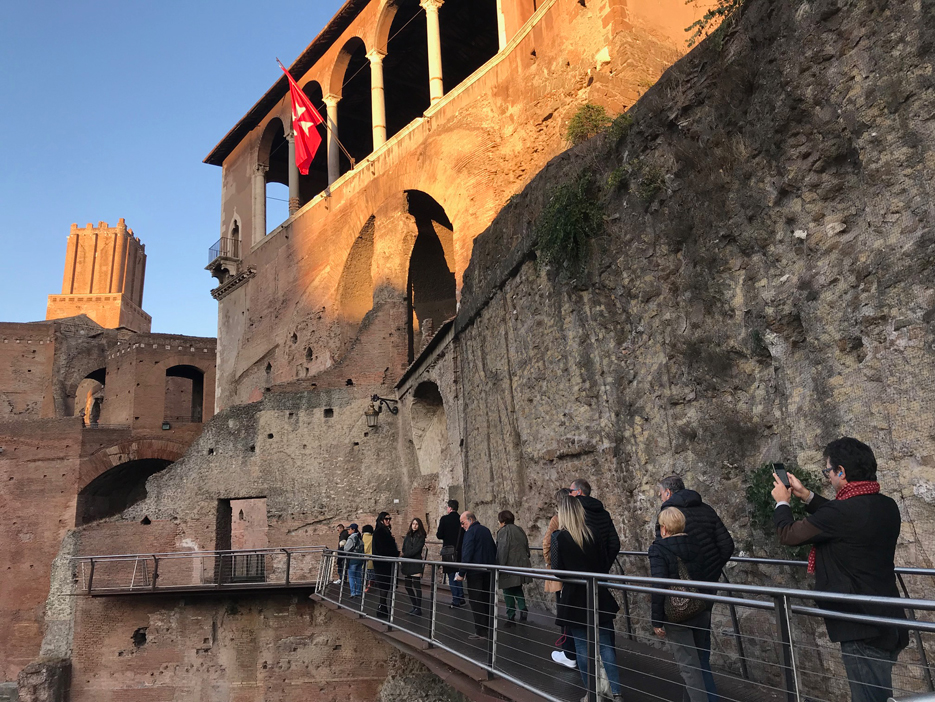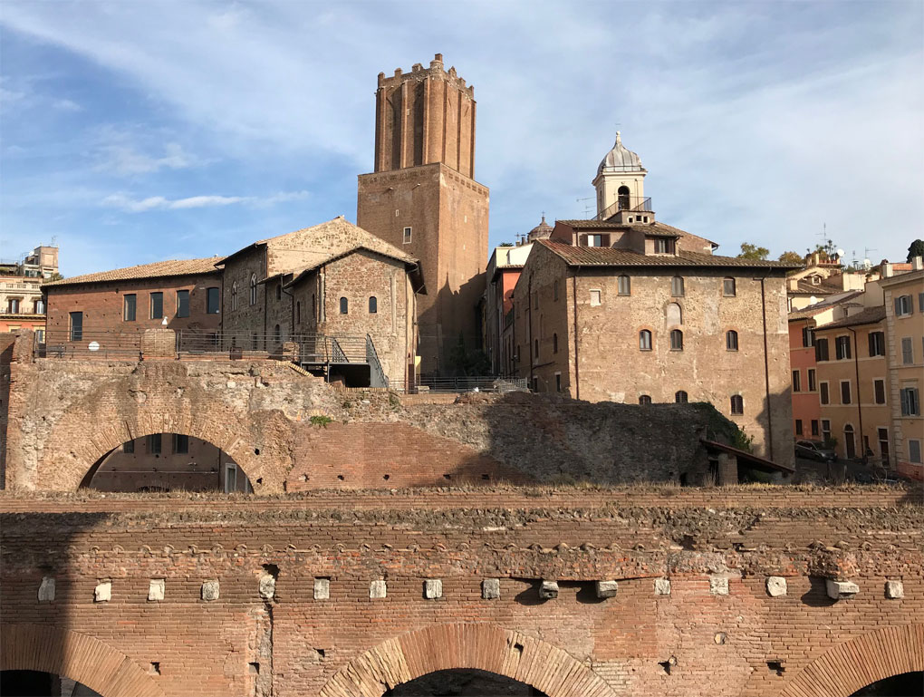 Itinerario nel quartiere della Suburra, oggi parte del rione Monti. L'area era nell'antichità destinata ad abitazioni popolari che si affacciavano su strade strette e ha mantenuto nei secoli parte dell'originario tracciato viario. L'itinerario avrà inizio dalla torre dei Conti, antica struttura costruita sul Foro della Pace, per proseguire con le “Colonnacce”, ovvero gli elementi superstiti del Foro di Nerva. Proseguiremo con la Porticus Absidata e con il Muro augusteo che ancora oggi segna il confine tra i Fori e la Suburra. Continueremo con la casa dei Cavalieri di Rodi, le strutture di Campo Carleo, la torre ed il palazzo del Grillo, la romantica via degli Ibernesi, i Mercati di Traiano, la casa di Petrolini e la Torre delle Milizie. Termineremo nelle suggestive piazze suburrane: piazza degli Zingari, piazza della Suburra e piazza della Madonna dei Monti.